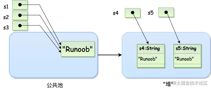 String 创建的字符串存储在公共池中,而 new 创建的字符串对象在堆上