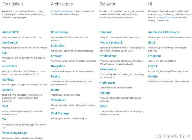 谷歌仍旧不断的完善Android Jetpack,截至到2019年8月已经有很多新加的组件并没有显示在上图中,比如CameraX等。Android Jetpack分类有4种,分别是Architecture、Foundationy、Behavior、UI,下面分别介绍下。