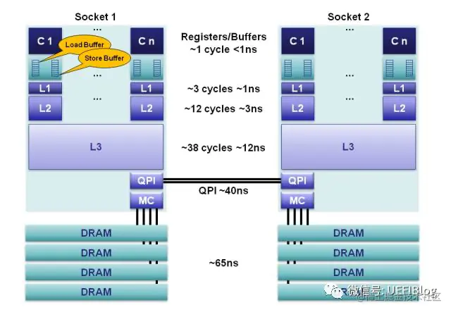 CPU访问速率从上到下依次递减,访问寄存器和(Store/Load) Buffers最快,访问内存最慢,两者速率相差过百倍。(磁盘寻道时间更长,1次磁盘寻道时间在10ms左右,耗时约为内存访问的10^5倍)