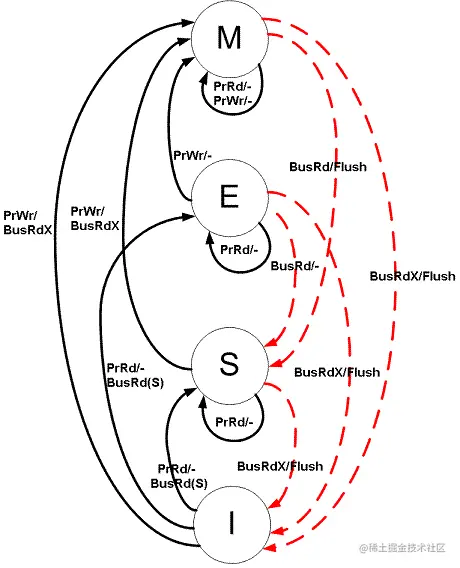 - Modified(M):缓存行是脏(dirty)的,与主存值不同。当前core可继续写入;如果其他core要读主存这块数据,该缓存行必须回写到主存,状态变为S。