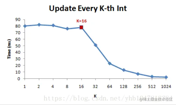 在Cache Line为64B的机器下,k取不同值,代码的运行时间比率大致如下: