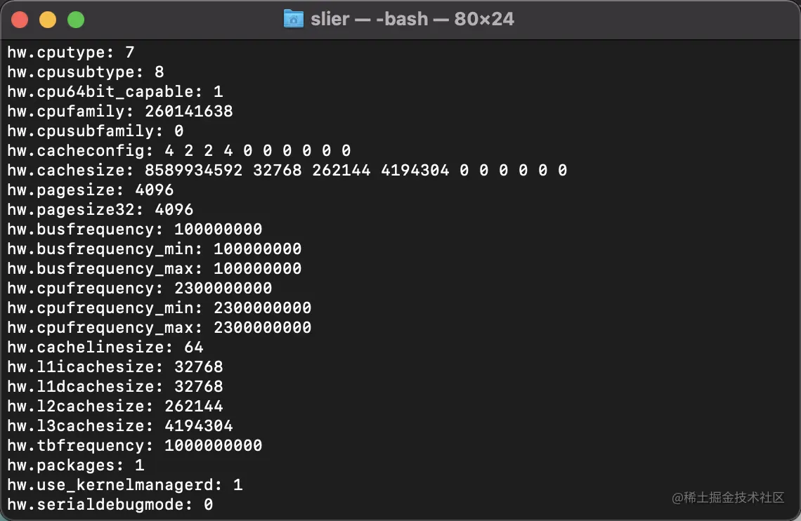 上图为"sysctl hw"命令显示出的mac cpu相关信息,cache size单位为B(字节)。