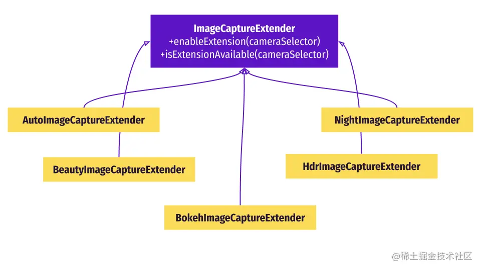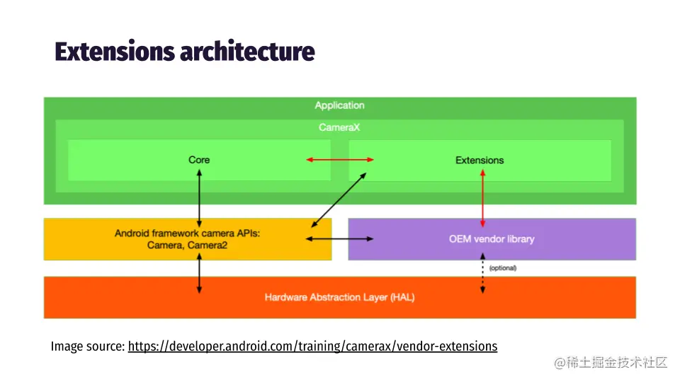 扩展与CameraX的Camera2核心分开。在下一个图表中,红色箭头表示当用户触发基于扩展的功能时的主要数据流,例如HDR图像捕获。