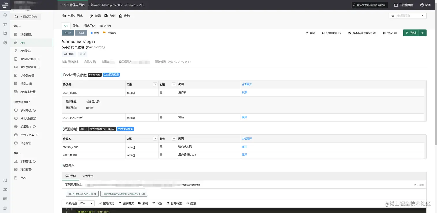 API工具在展示API时,不仅可包含API的基础信息,如请求参数、url等,还可查看API 的状态、示例。Eolinker还可以查看变更历史与对比变更历史。