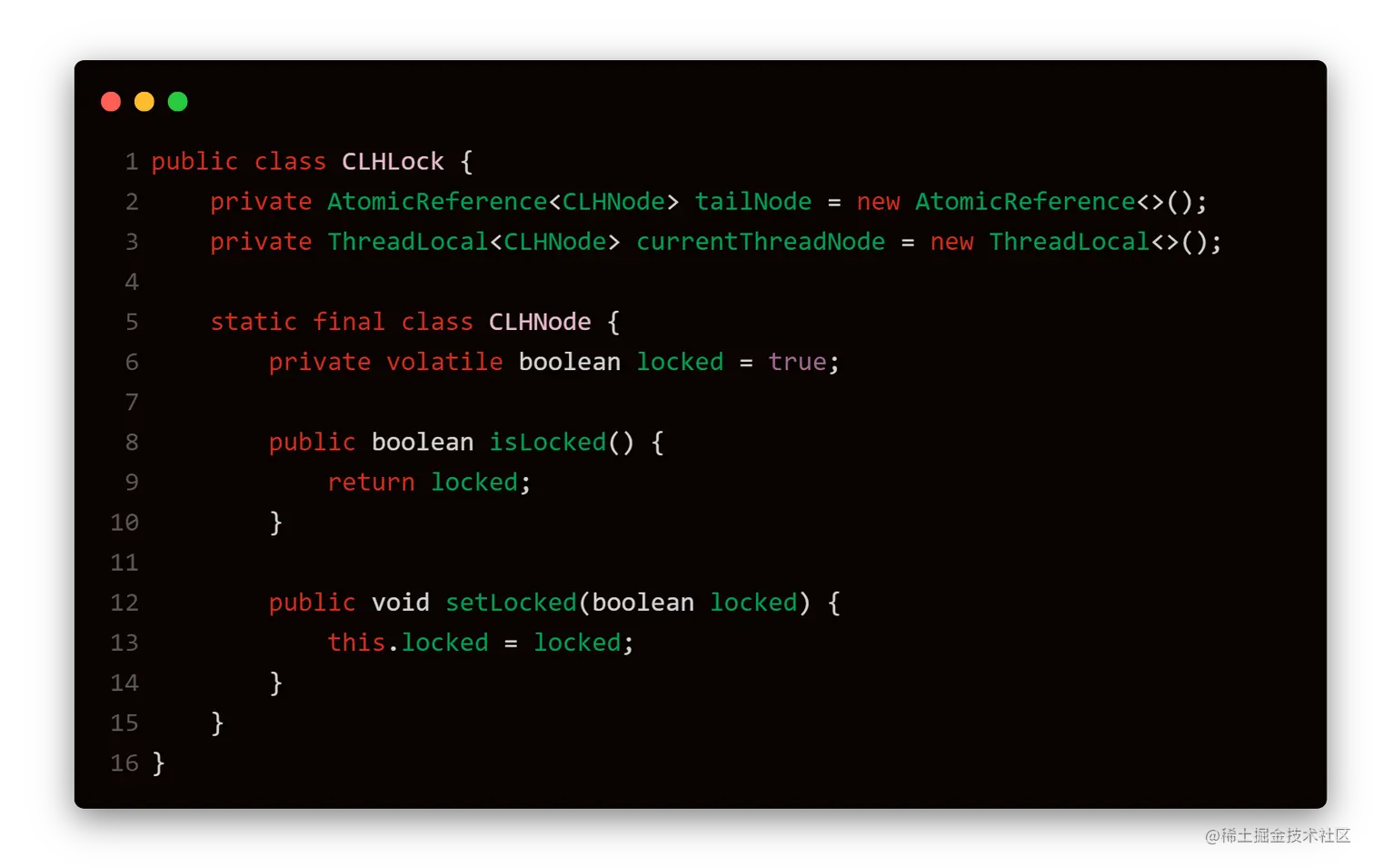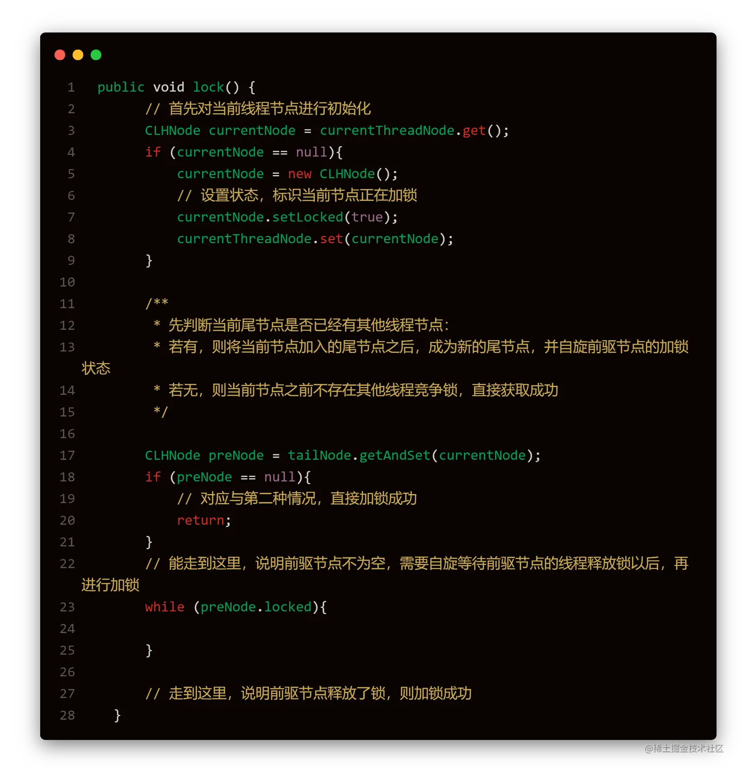 CLH锁也是一种基于链表的可扩展、高性能、公平(提供先来先服务)的自旋锁,申请线程只在本地变量上自旋,它不断轮询前驱的状态,如果发现前驱释放了锁就结束自旋。由于是 Craig、Landin 和 Hagersten三位大佬的发明,因此命名为CLH锁。