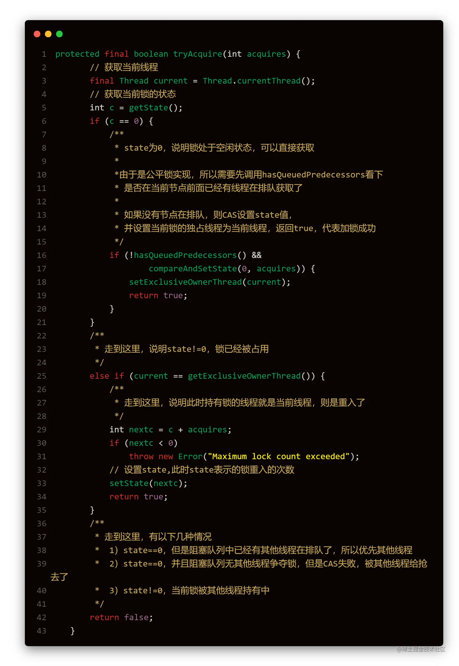在acquire中首先调用tryAcquire尝试获取锁,如果tryAcquire返回true,则此方法直接返回,代表加锁成功,否则需要执行addWaiter(Node.EXCLUSIVE)为当前线程创建队列节点并入队,然后调用acquireQueued(final Node node, int arg)再次尝试获取锁,或挂起当前线程等待被唤醒,被唤醒以后继续尝试获取锁,直到加锁成功。
