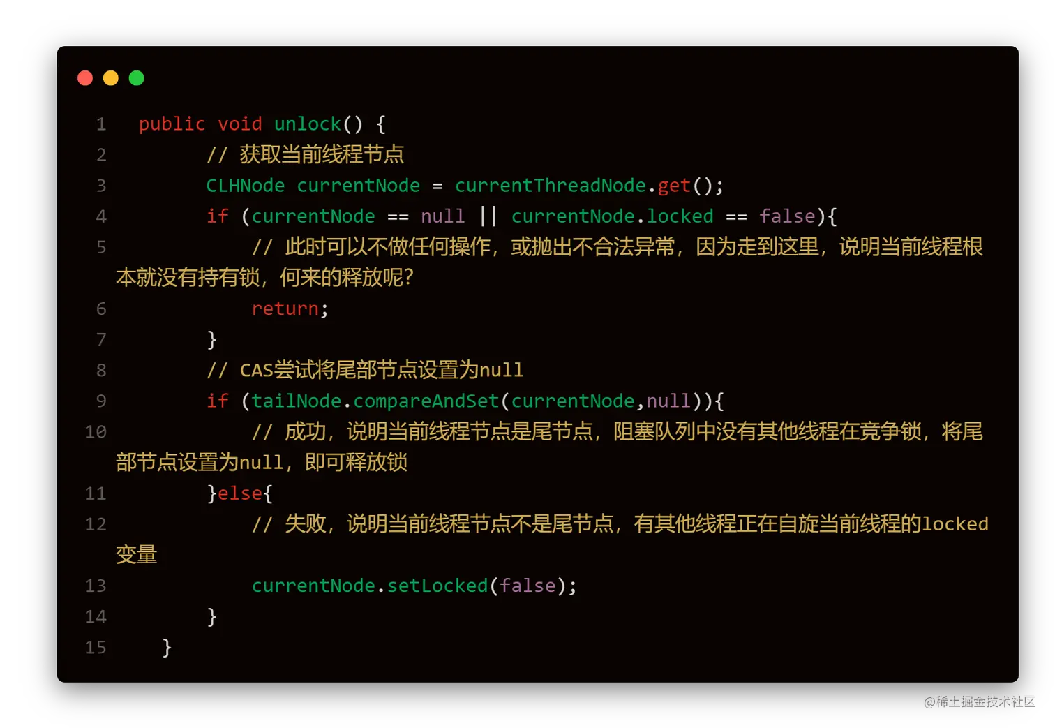释放锁的过程主要是将当前节点locked标志位置为false的过程。也分情况,如果当前释放锁的线程节点是尾节点,则说明没有其他线程在等待队列中,直接将尾节点设置为null即可,否则需要将当前节点的locked标志位设置为false,来通知等待队列中线程锁已被释放。
