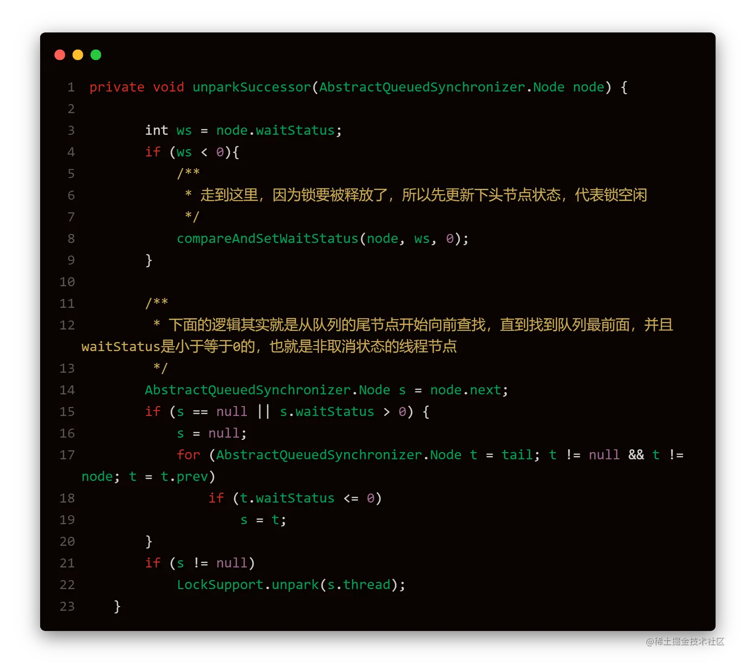 但是我个人觉得,就算遍历不到也没事,因为如果说上述代码的第三行还没执行,一定可以说明新加入的这个node还没走到shouldParkAfterFailedAcquire,所以本身就没被挂起,所以遍历不到无所谓了。