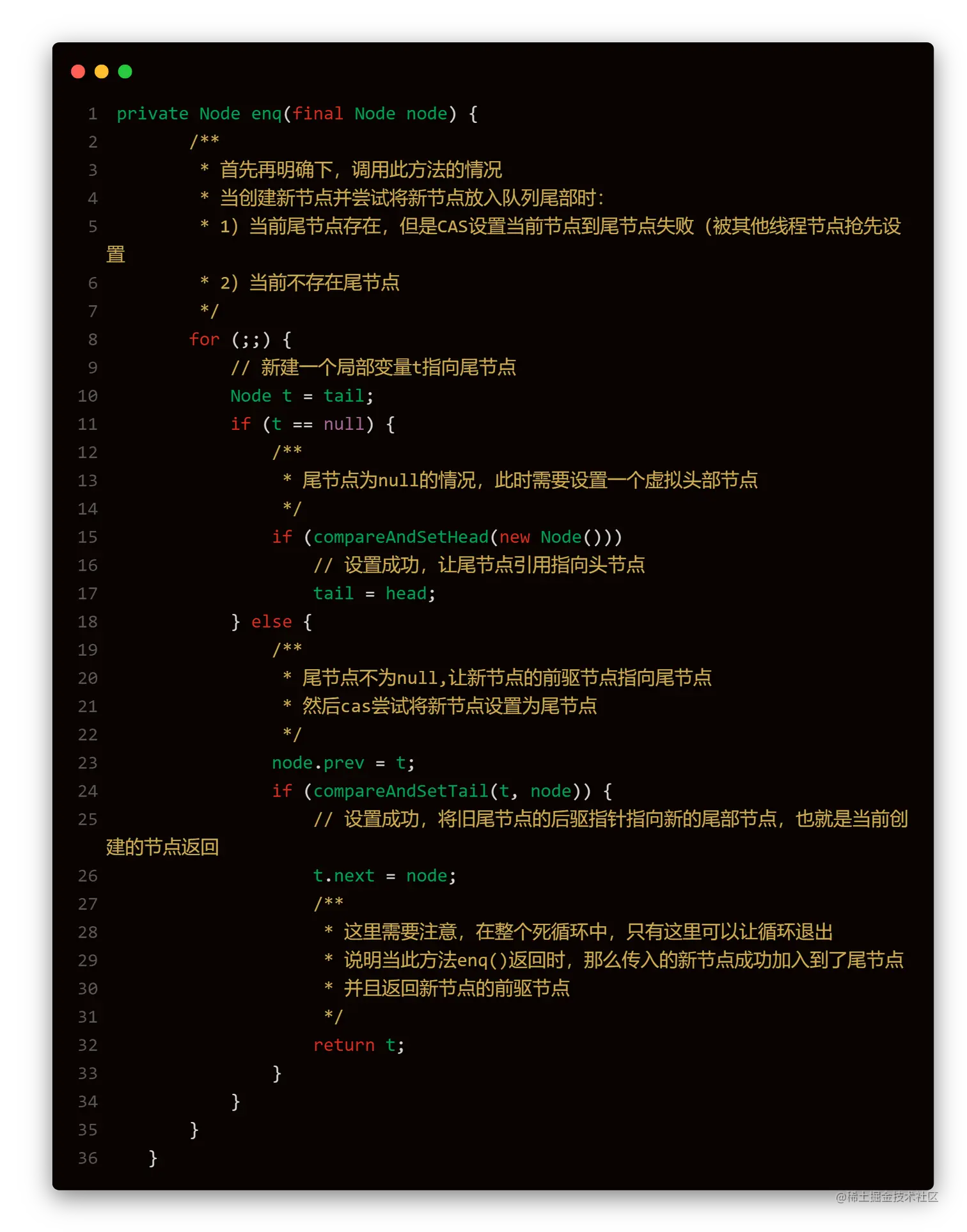 第一行代码和第三行代码并不是原子性的,所以会产生,新加入的node节点前驱已经指向了旧的尾节点,但是旧的尾节点的后继节点并没有指向新加入的node节点(pred.next = node;还没执行),所以导致从前向后遍历,可能根本遍历不到新加入的这个node节点。