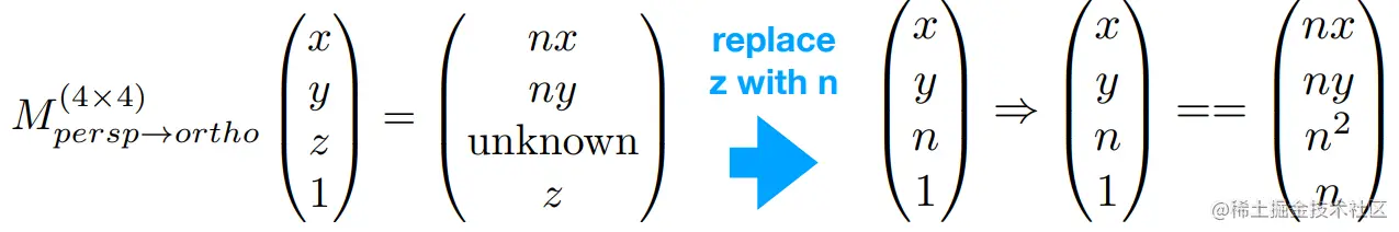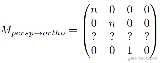 - 首先,把截锥压成一个长方体(n->n, f->f)(Mpersp−>ortho)