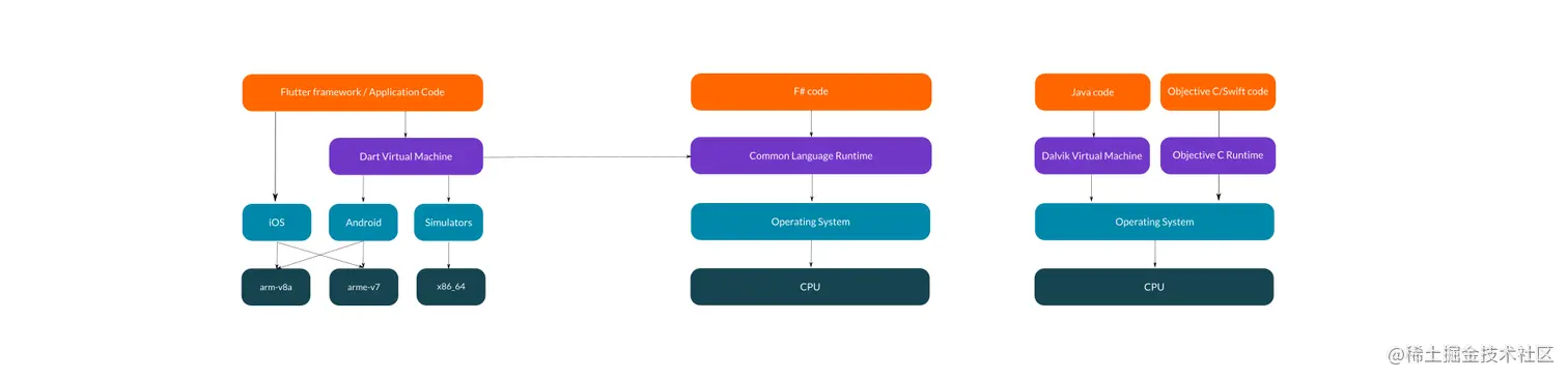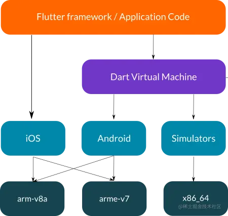 在Android上,你的应用程序代码和框架本身被编译成字节码,然后由Dart VM进行JIT编译,并由操作系统在CPU上执行。