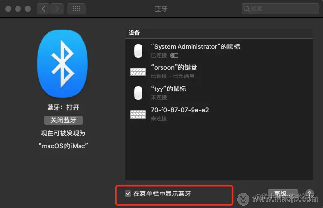 如果想让图标再次显示怎么办?打开【系统偏好设置】,勾选【在菜单栏中显示 x x】即可,如下图所示: