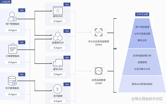 华为云立体运维解决方案是为云上客户量身定制的一个解决方案,包含AOM(应用运维管理服务)、APM(应用性能管理服务)、LTS(日志服务)。覆盖IaaS层的基础设施状态,Paas层的中间件及数据库状态,应用层的各类应用状态及指标这三层,形成立体化运维分析能力。华为云立体化运维解决方案遵循DevOps标准,可以敏捷高效的获取云上应用的各类异常,并辅助运维人员快速定位。同时立体化运维解决方案以应用为中心,展示应用指标、拓扑、状态信息,提供应用视角的监控运维模式,满足日常巡检、故障排查等多种运维场景。