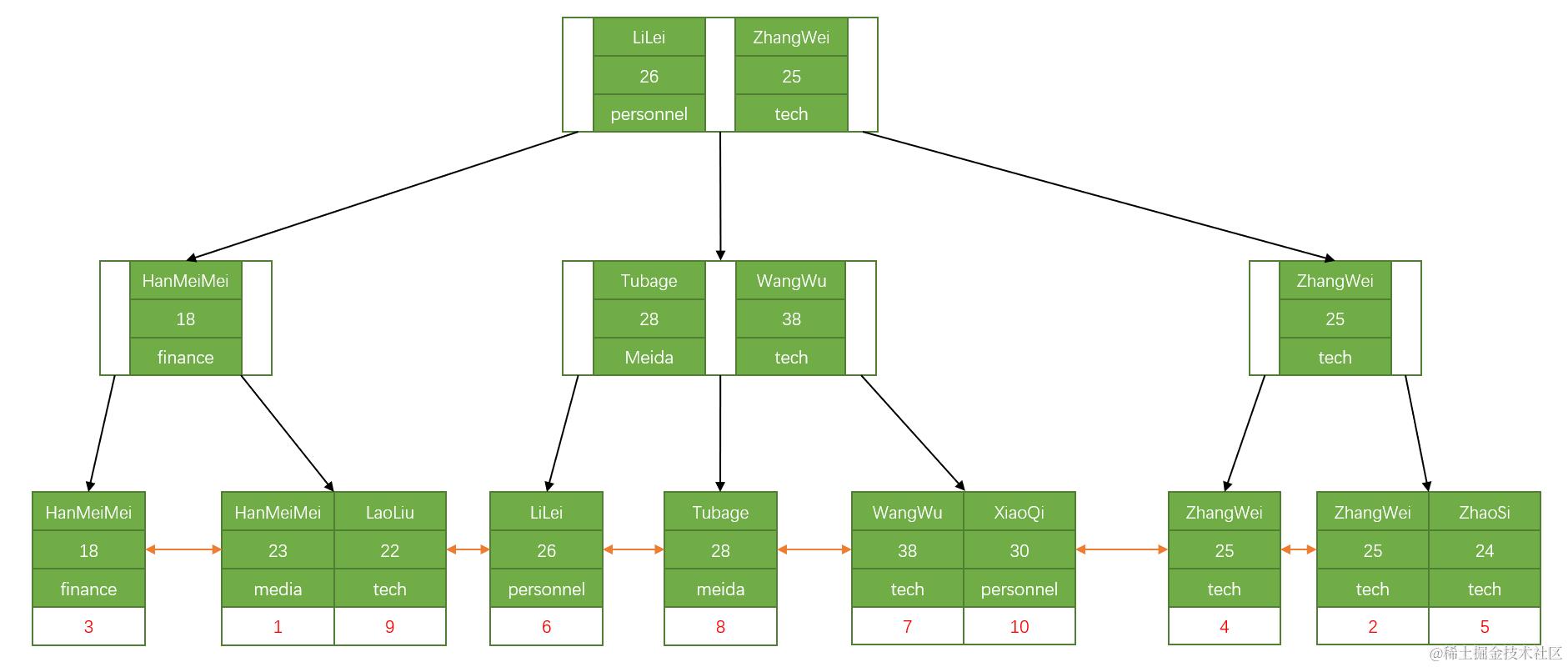 | ~ where name = 'HanMeimei' and dept = 'finance' | ✔ | 索引只用到了 name 字段;通过 B+tree 查到了 name = 'HanMeimei' 的节点后再从这里面挨个比较 dept 字段 |