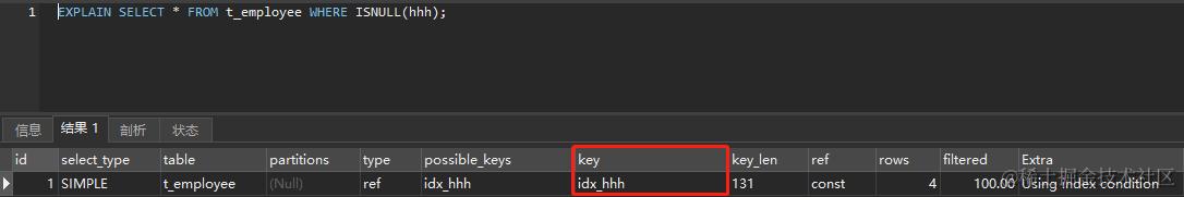 EXPLAIN SELECT * FROM t_employee WHERE ISNULL(hhh);