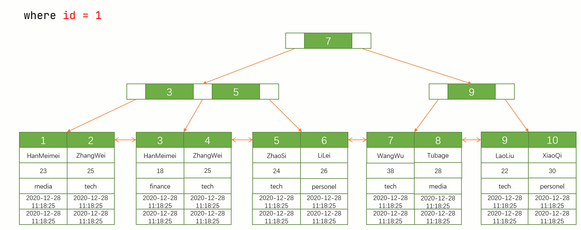 | ~ where name like '%Han%' | ❌ | 最左边是%,具体的值是模糊不定的,没办法在 B+tree 中进行值比较。 |