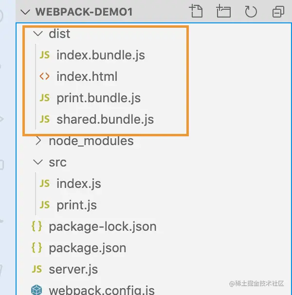 index.js,print.js都包含了lodash,即上述所说,这种方式如果条目块之间有任何重复的模块,则它们将同时包含在两个包文件中。