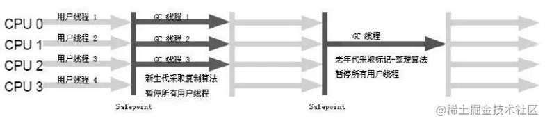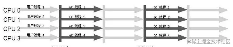 ● 并行(Parallel):指多条垃圾收集线程并行工作,但此时用户线程仍然处于等待状态。