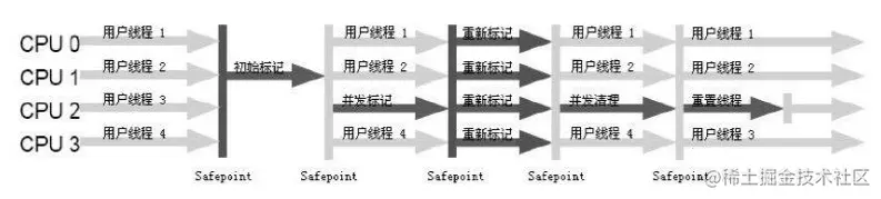 CMS 收集器是基于“标记—清除”算法实现的,它的运作过程相对于前面几种收集器来说更复杂一些,整个过程分为 4 个步骤: