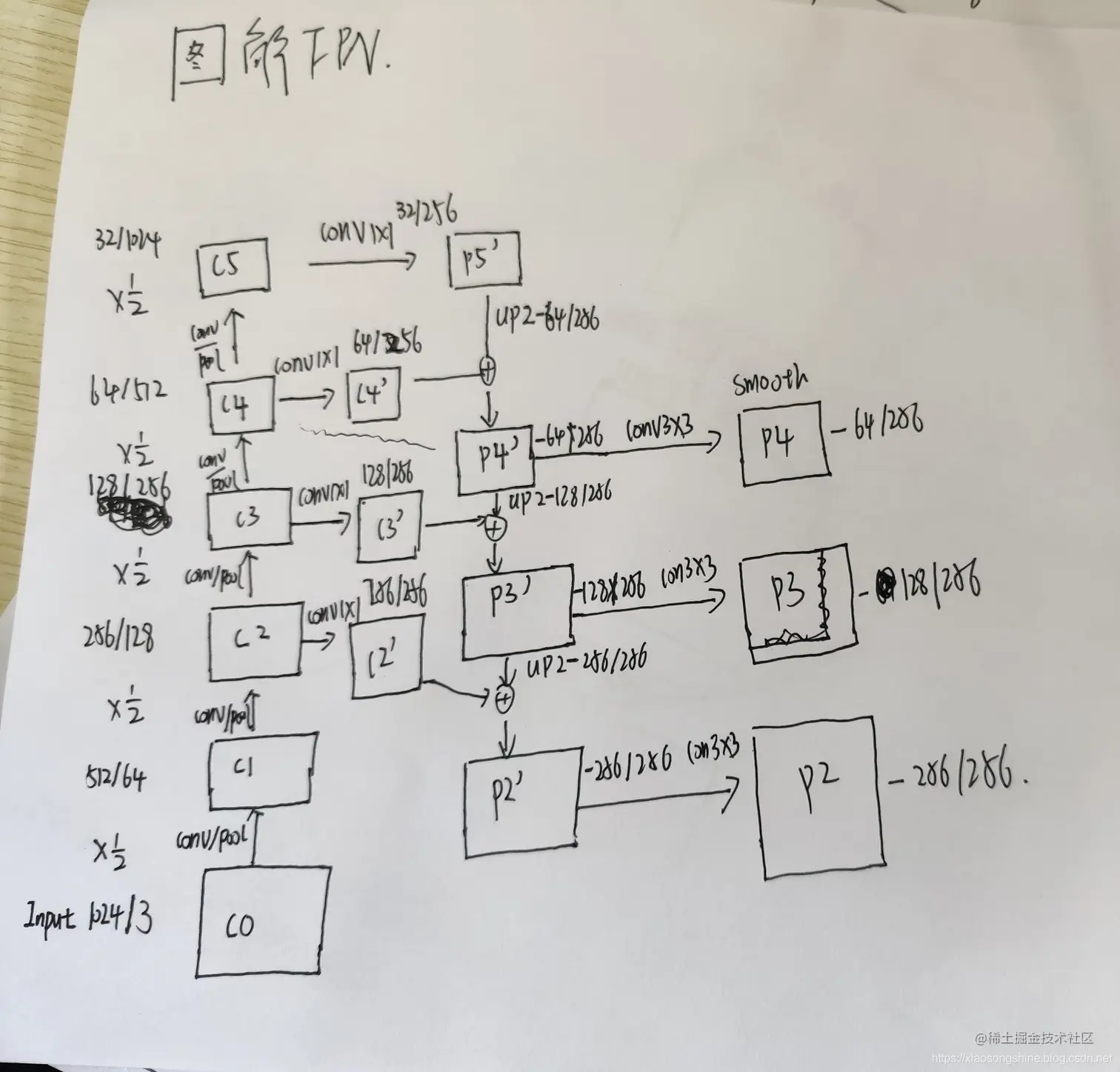 {C2, C3, C4, C5} 层对应的融合特征层为 {P2, P3, P4, P5},对应的层空间尺寸是相通的。