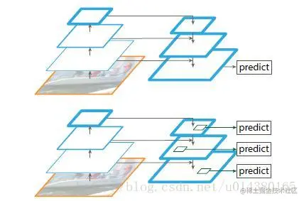 如图 (c),SSD 较早尝试了使用 CNN 金字塔形的层级特征。理想情况下,SSD 风格的金字塔 重利用了前向过程计算出的来自多层的多尺度特征图,因此这种形式是不消耗额外的资源的。但是 SSD 为了避免使用 low-level 的特征,放弃了浅层的 feature map,而是从 conv4_3 开始建立金字塔,而且加入了一些新的层。因此 SSD 放弃了重利用更高分辨率的 feature map,但是这些 feature map 对检测小目标非常重要。这就是 SSD 与 FPN 的区别。