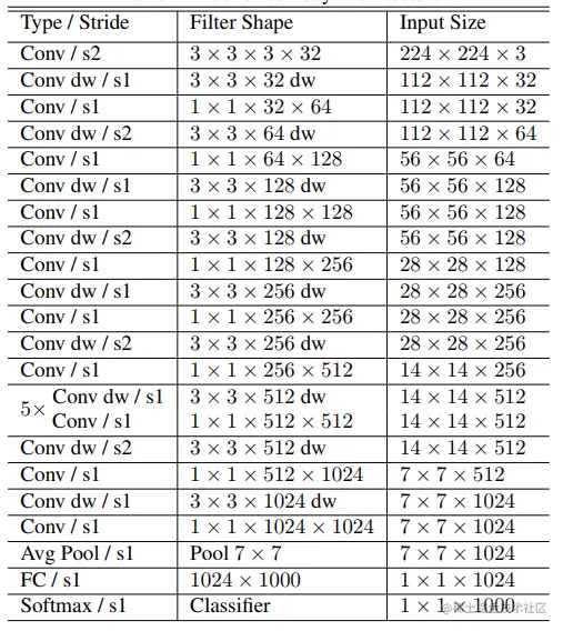 如上图所示,首先是一个 3x3 的标准卷积,然后后面就是堆积 depthwise separable convolution,并且可以看到其中的部分 depthwise convolution 会通过 strides=2(步长)进行 down sampling(下采样)。然后采用 average pooling(平均池化)将 feature 变成 1x1,根据预测类别大小加上全连接层,最后是一个 softmax 层。如果单独计算 depthwise convolution 和 pointwise convolution,整个网络有 28 层(这里 Avg Pool 和 Softmax 不计算在内)。