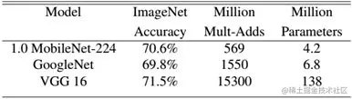 MobileNet 到底效果如何,这里与 GoogleNet 和 VGG16 做了对比,如下图所示: