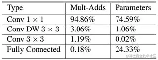 可以看到整个计算量基本集中在 1x1 卷积上,如果你熟悉卷积底层实现的话,你应该知道卷积一般通过一种 im2col 方式实现,其需要内存重组,但是当卷积核为 1x1 时,其实就不需要这种操作了,底层可以有更快的实现。对于参数也主要集中在 1x1 卷积,除此之外还有就是全连接层占了一部分参数。