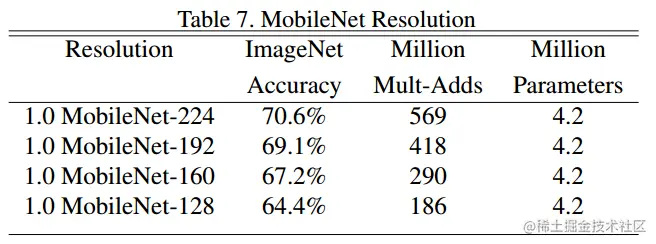第二个超参数是分辨率乘数 ρ ,比如原来输入特征图是 224x224,可以减少为 192x192。分辨率乘数用来改变输入数据层的分辨率,同样也能减少参数。在 α 和 ρ 共同作用下,MobileNets 某一层的计算量为: