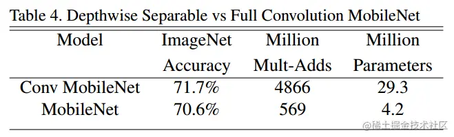 同样是 MobileNets 的架构,使用可分离卷积,精度值下降 1%,而参数仅为 1/7。