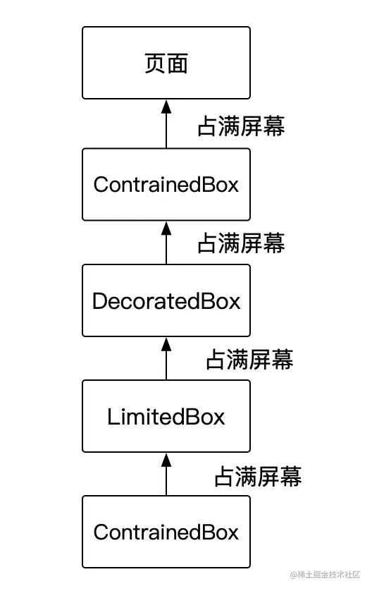 首先最外层的ConstrainedBox接收到来自页面的紧约束(max=min=屏幕宽度),计算采用上面的计算方式还是得到了一个同样的约束,之后这个约束向下传递,就变成和案例一一样的情况