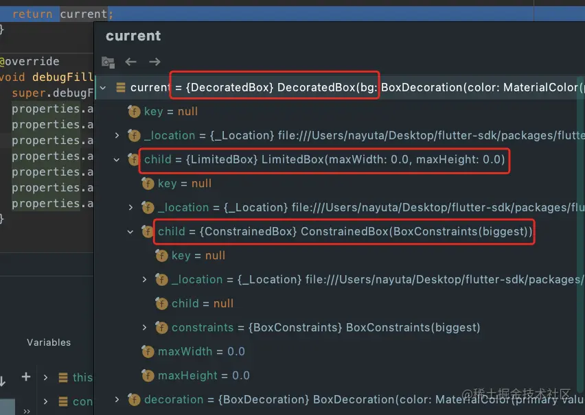 如图,如果我们直接返回一个红色Container,这个时候他会撑满整个屏幕。首先Container是一个组合类的Widget,并不负责渲染。查看他的build方法,在这种情况下返回了三层RenderObject RenderDecoratedBox,RenderLimitedBox,RenderConstrainedBox
