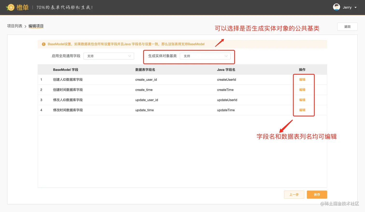 - 配置工程时,可选择是否开启基于 BaseModel 的实体对象全局公有字段,用户可根据偏好修改公有字段名称。如不开启,则仍然保留原有功能,既可为每个数据表指定不同的公有字段属性。