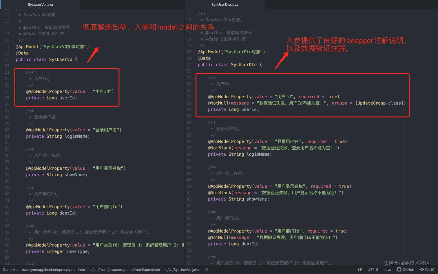 - 单体和微服务工程均支持 DTO 和 VO 相关代码的生成,进一步解耦数据组装,同时也为 Swagger 提供了更好的支持。