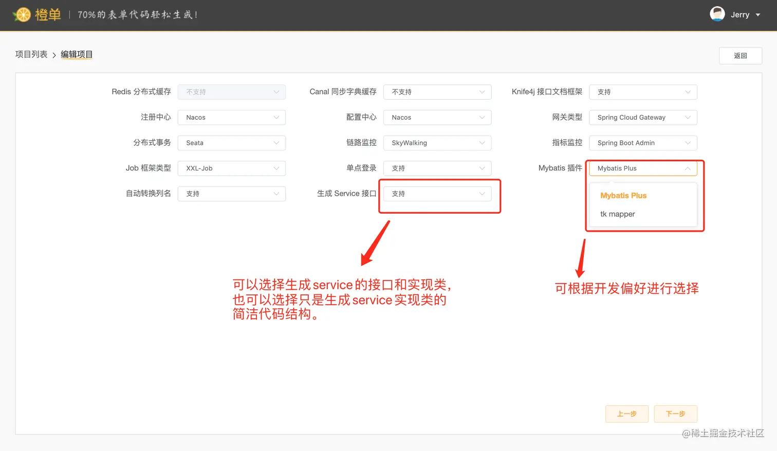 - 新增支持 Mybatis Plus,配置工程时可选择 Mybatis 插件,目前已同时支持最主流的 Mybatis Plus 和 tk mapper。