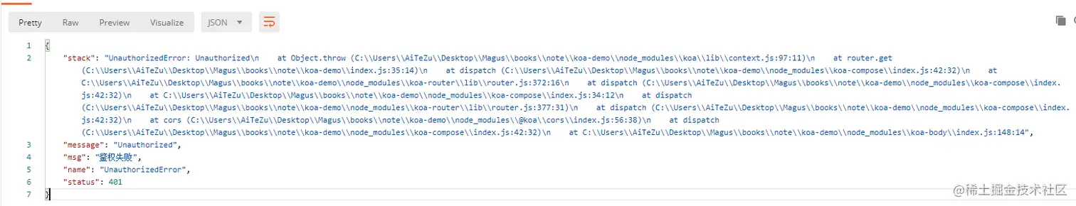 ctx.assert: 当断言的值不存在或者出现错误的时候, 就会抛出异常// 如果 ctx.state.name 没有定义就会出现这个错误 ctx.assert(ctx.state.name, 401, 'user is not defined'); -