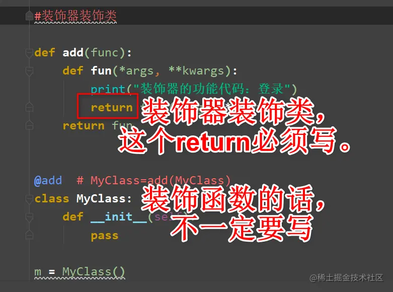 把类当作一个参数传到装饰器里面。return fun返回的是fun,MyClass接收到的是fun。