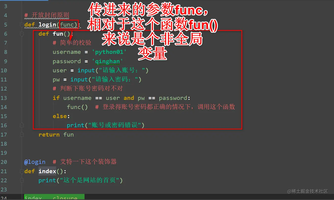 @login是 Python 中的一个语法糖。它的作用是:index=login(index)。传入index,然后被index接收。