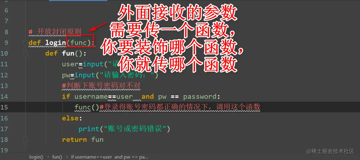把闭包函数当成装饰器来用的话,外面接收的参数需要传一个函数,你要装饰哪个函数,你就传哪个函数。