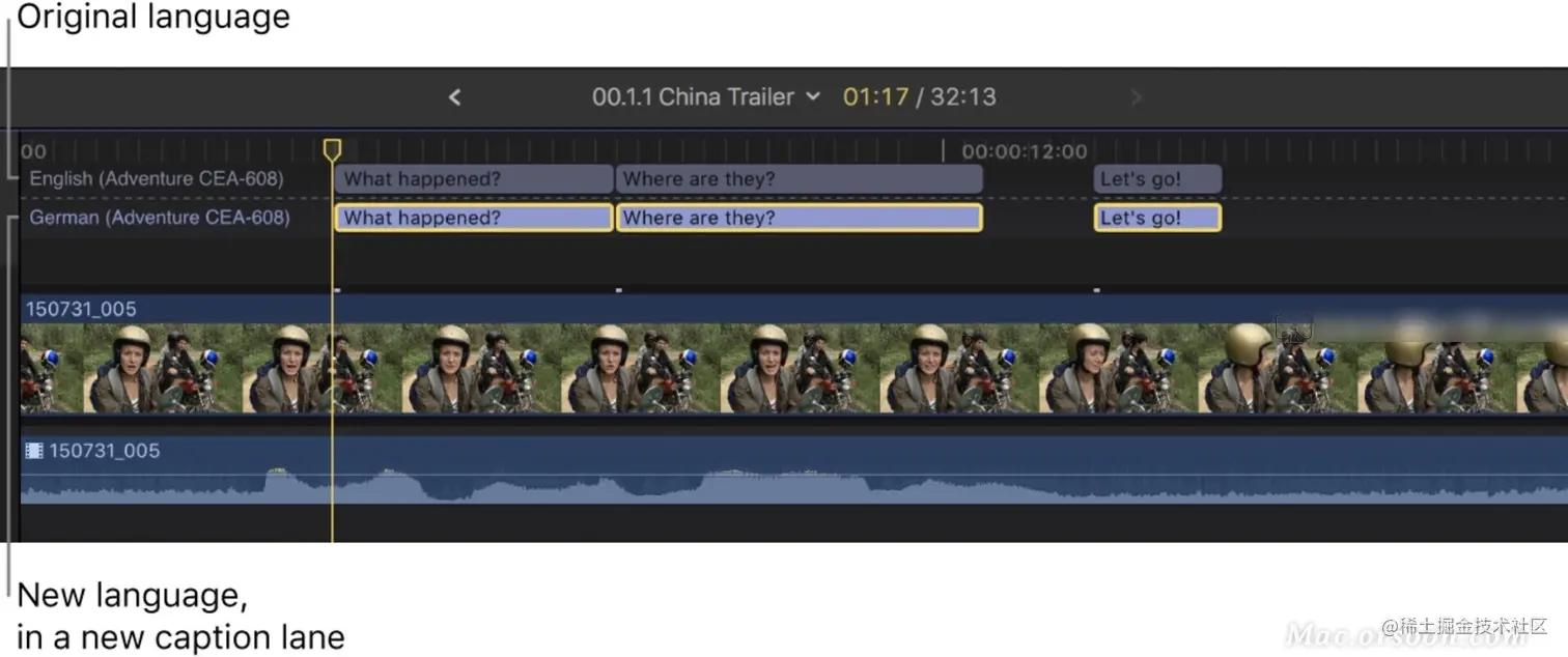 - 新语言在时间线中显示为新字幕通道条。