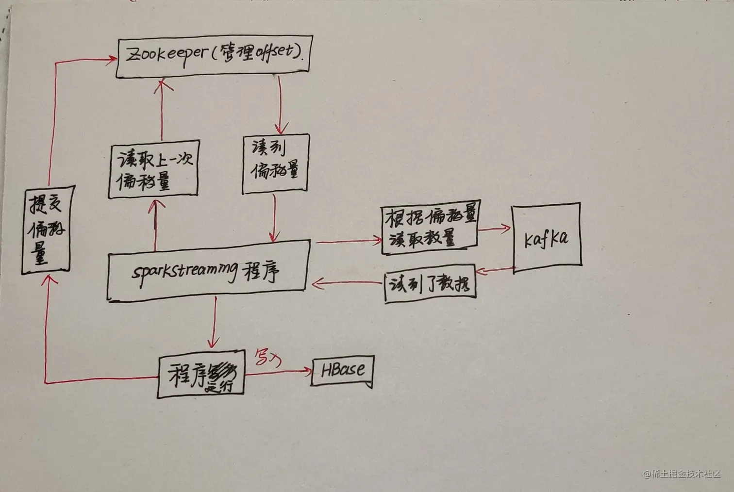 用ZooKeeper集群管理偏移量,程序启动后,就会读取上一次的偏移量,读取到数据后,SparkStreaming就会根据偏移量从kafka中读取数据,读到数据后,程序会运行。运行完后,就会提交偏移量到ZooKeeper集群,但有一个小问题,程序运行挂了,但偏移量未提交,结果已经部分到HBase,再次重新读取的时候,会有数据重复,但只影响一批次,对大数据来说,影响太小!