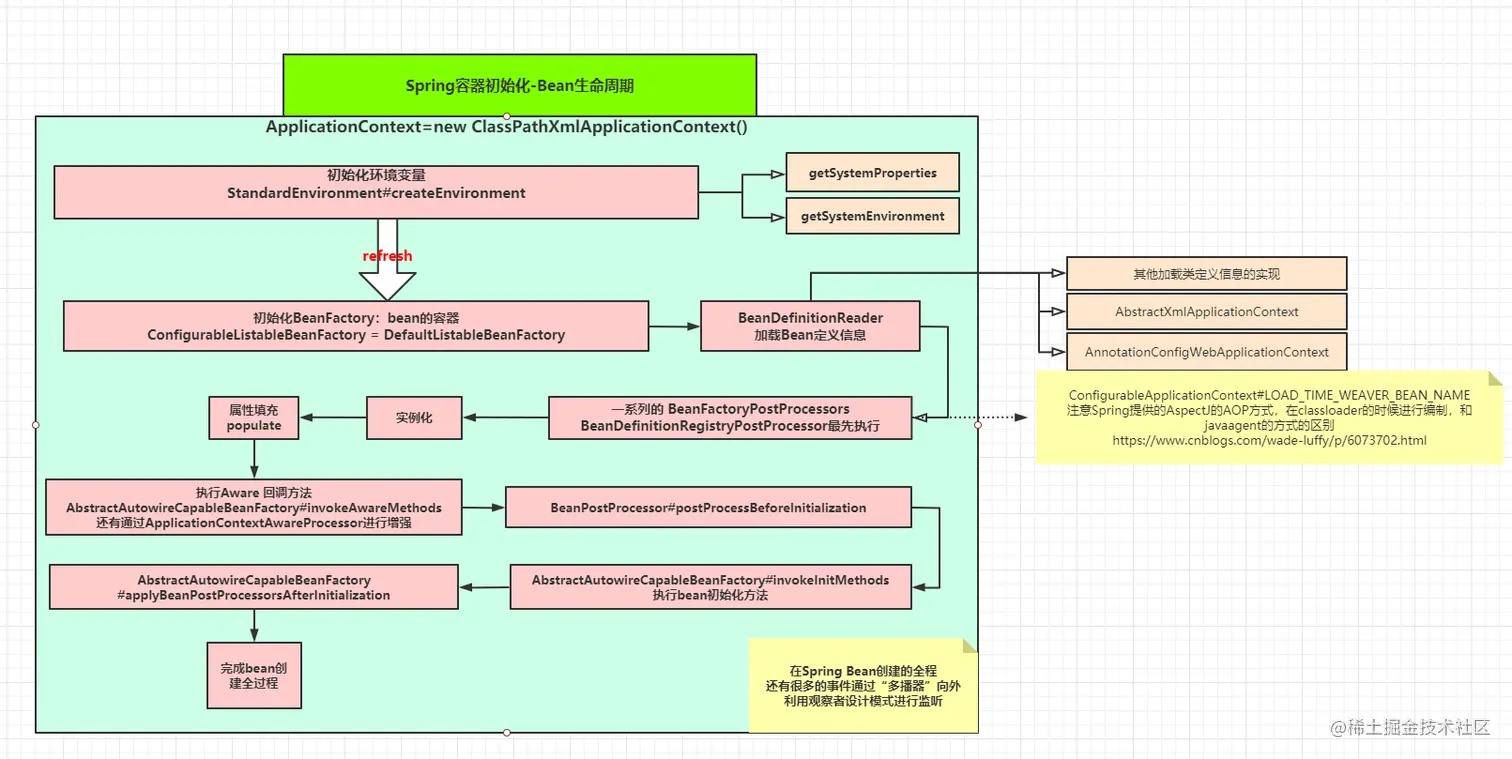 (day 9)持续学习:Spring源码阅读-Bean生命周期 Demons99578 2021-01-05 102 阅读1分钟 由于最近比较忙,前面一周时间虽然保持着每日的学习时间,但是写掘金的文章确实比较耗时间,所以每日的学习总结发出来。 前面学习了算法,后续会慢慢把算法部分总结再发出来。 今天阅读Spring的源码,并梳理生命周期。 时间不充足,文字就不多说了,后续再细化梳理。 Bean生命周期 在spring的体系中,重要的几个接口: