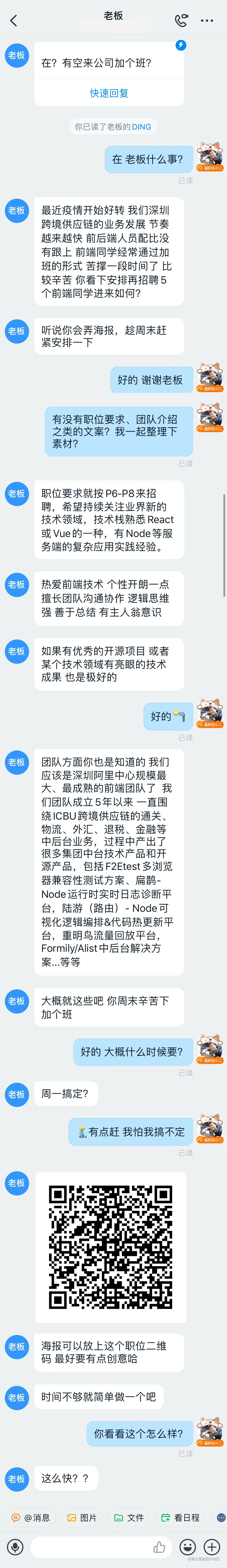 我在负责前端招聘战役,为了推广效果,采用了聊天记录的方式制作海报制作,早期的聊天记录海报如下所示: