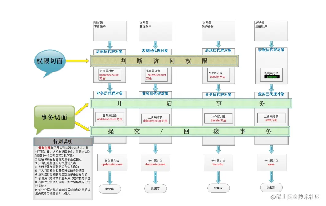 - 「⾯」:横切逻辑代码往往要影响的是很多个⽅法,每⼀个⽅法都如同⼀个点,多个点构成⾯,有⼀个⾯的概念在⾥⾯