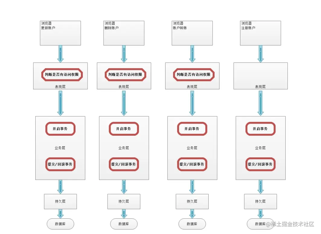 上图描述的就是未采⽤AOP思想设计的程序,当我们红⾊框中圈定的⽅法时,会带来⼤量的重复劳动。程序中充斥着⼤量的重复代码,使我们程序的独⽴性很差。⽽下图中是采⽤了AOP思想设计的程序,它把红框部分的代码抽取出来的同时,运⽤动态代理技术,在运⾏期对需要使⽤的业务逻辑⽅法进⾏增强。