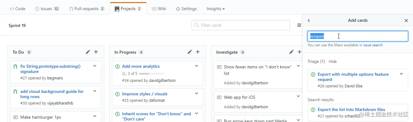 如果你想把你的issues添加到你的项目管理中来,你可以在页面右上方点击Add Cards搜索你想添加的,这里的搜索有特殊的语法,比如输入is:pr is:open,意味着你可以找到所有打开的PRs,如果你想修复bugs,输入label:bug。