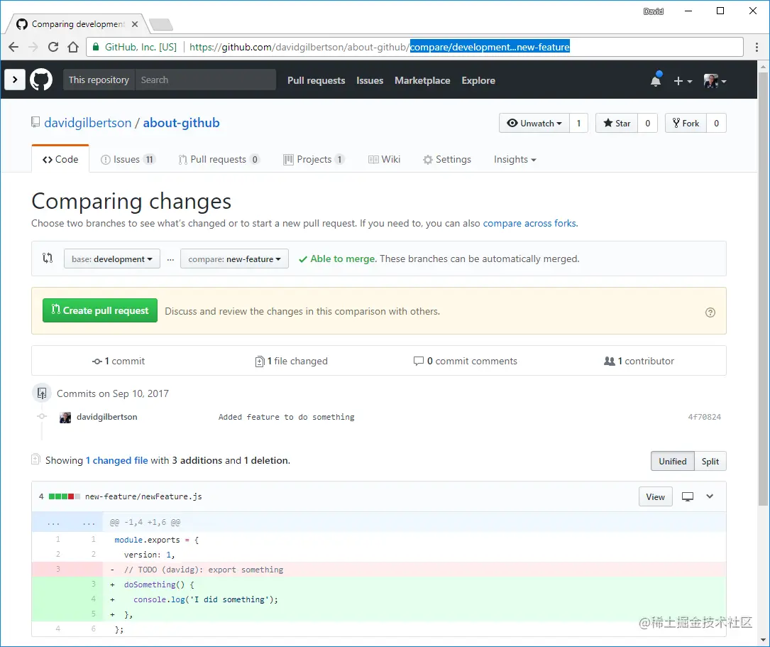 GitHub的页面导航已经做的很好了,但是有些时候直接在导航栏中输入会更快。比如你想跳转到一个分支,看下它与主干的区别,就可以直接在你仓库的后面输入/compare/branch-name: