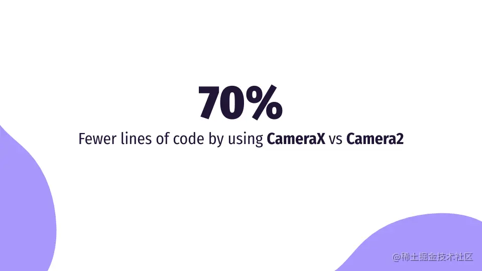 使用CameraX vs Camera 2的第一个优点是写入的行数减少了70%。有一个关于Monzo的案例研究,它减少了9000多行代码,并通过CameraX将注册辍学率提高了5倍。