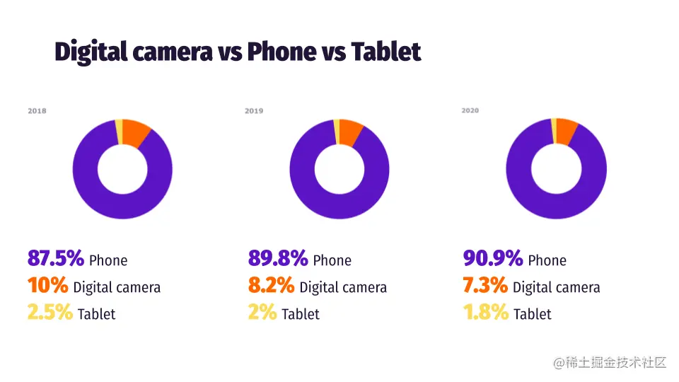 现在我们知道每年拍摄多少张照片,让我们看看用什么设备来制作这些照片,我们有三个主要类别:数码相机、手机和平板电脑。