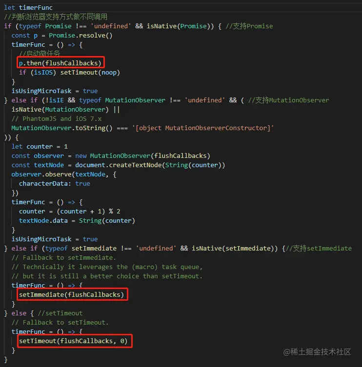 Vue 在内部对异步队列尝试使用原生的 Promise.then 、 MutationObserver 和 setImmediate ,如果执行环境不支持,则会采用 setTimeout(fn, 0) 代替。